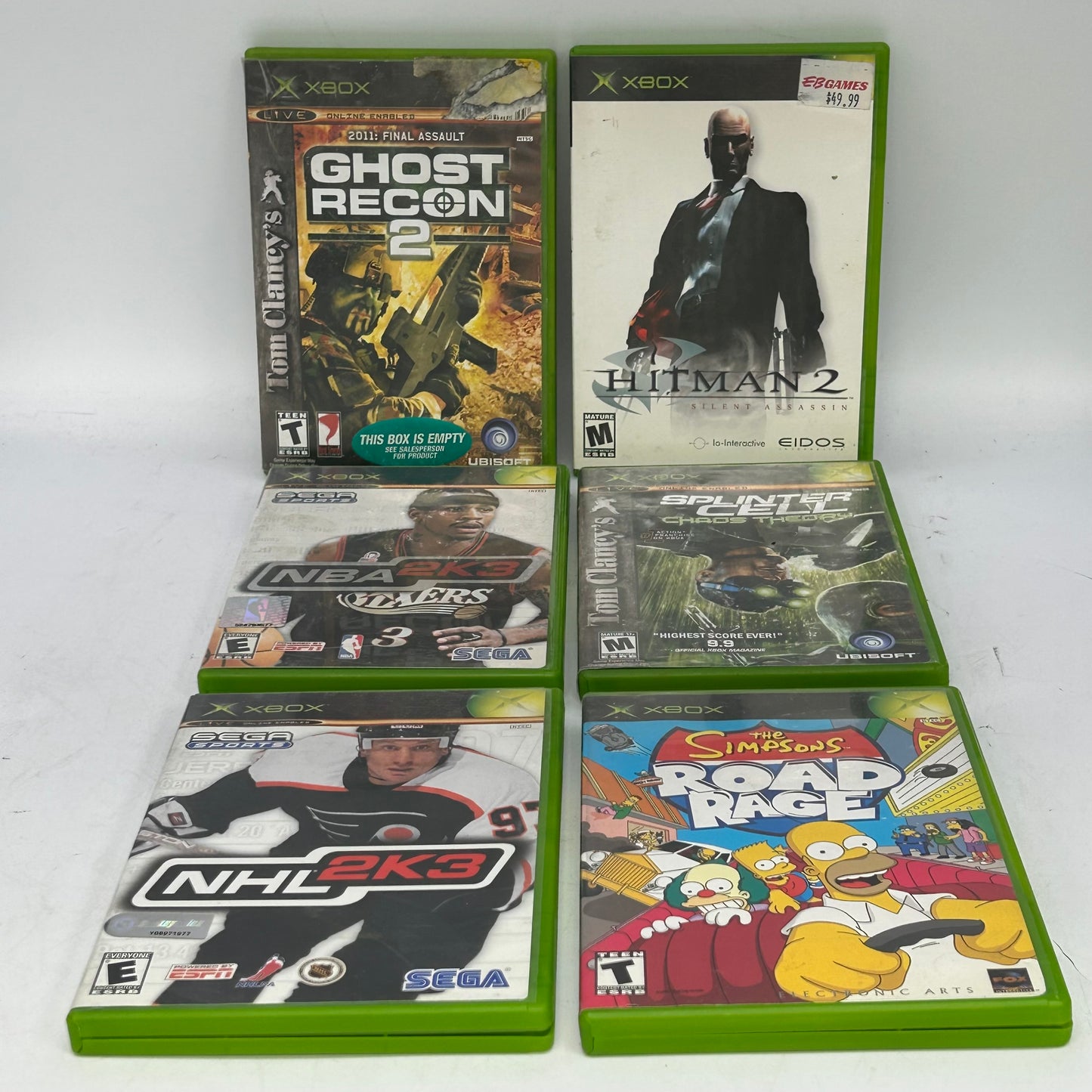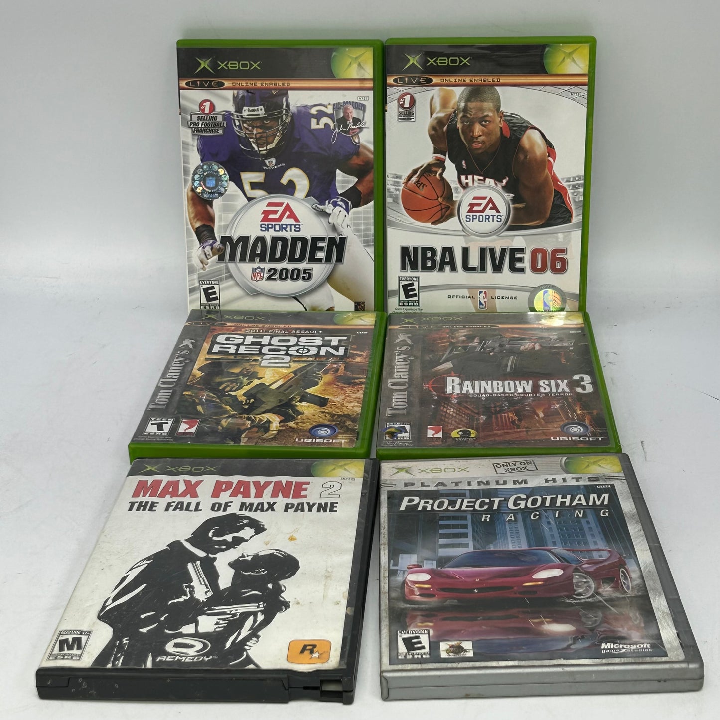 NBA Ballers (with box/case, no manual)NBA Live 2005 (with box/case, no manual)NHL 2K3 (with box/case, no manual)Ghost Recon 2 (with box/case, no manual)Project Gotham Racing (with box/case, no manual)Rainbow Six 3 (with box/case, no manual)Hitman 2 (with box/case, no manual)NBA Live 06 (with box/case, no manual)Max Payne 2 (with box/case, no manual)Ghost Recon 2 (with box/case, no manual)Splinter Cell Chaos Theory (with box/case, no manual)Madden 2005 (with box/case, no manual)The Simpsons Road Rage (with box/case, no manual)NBA 2K3 (with box/case, no manual)